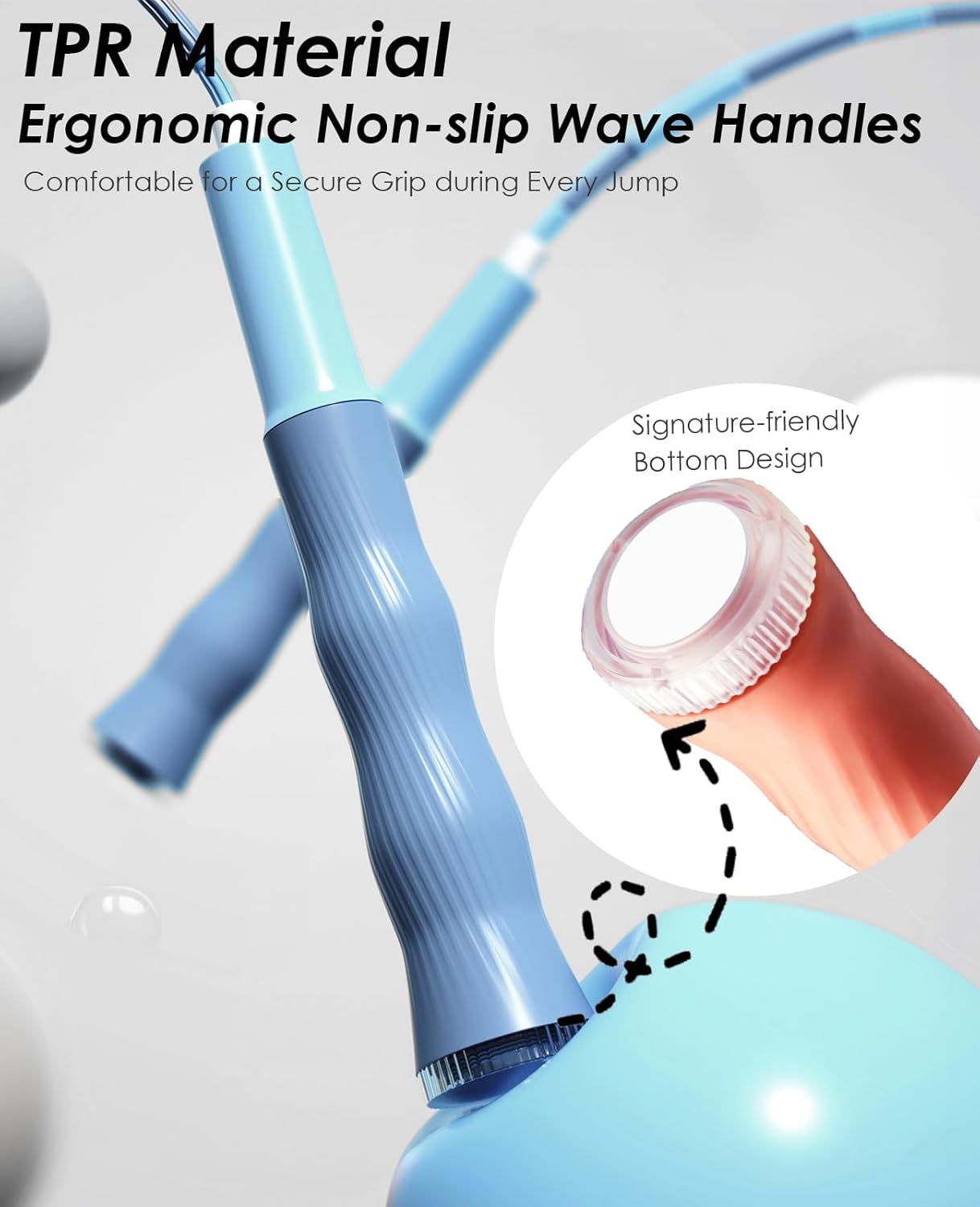 • Ergonomic Non-Slip Handles: Designed for ultimate comfort and grip, our workout jump rope features ergonomic, non-slip handles made from durable TPR material. TPR combines the flexibility of rubber with the toughness of plastic, providing a soft, wave-textured grip that ensures a secure hold during every jump, preventing any slipping or discomfort. This makes it ideal for active workouts. You can jump, skip, and play without worry!